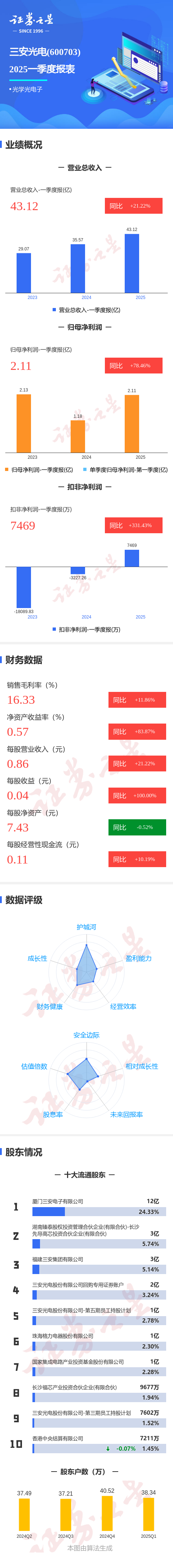 图解三安光电一季报: 第一季度单季净利润同比增78.46%